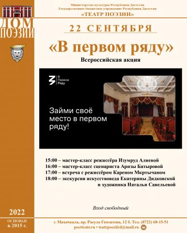 22 сентября в Театре поэзии в рамках Всероссийской акции «В первом ряду» пройдут мастер-класс, встречи, экскурсии.