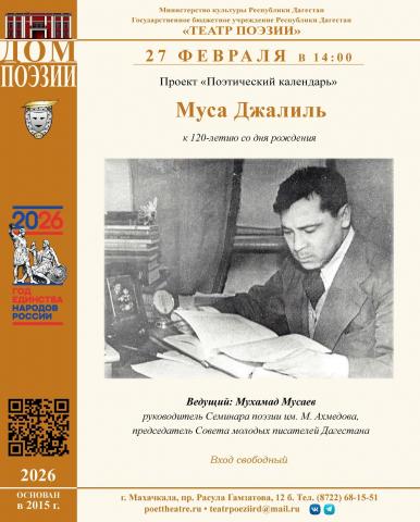 27 февраля в 14:00, в рамках проекта «Поэтический календарь», в Театре поэзии состоится встреча к 120-летию со Дня рождения советского поэта Мусы Джалиля.