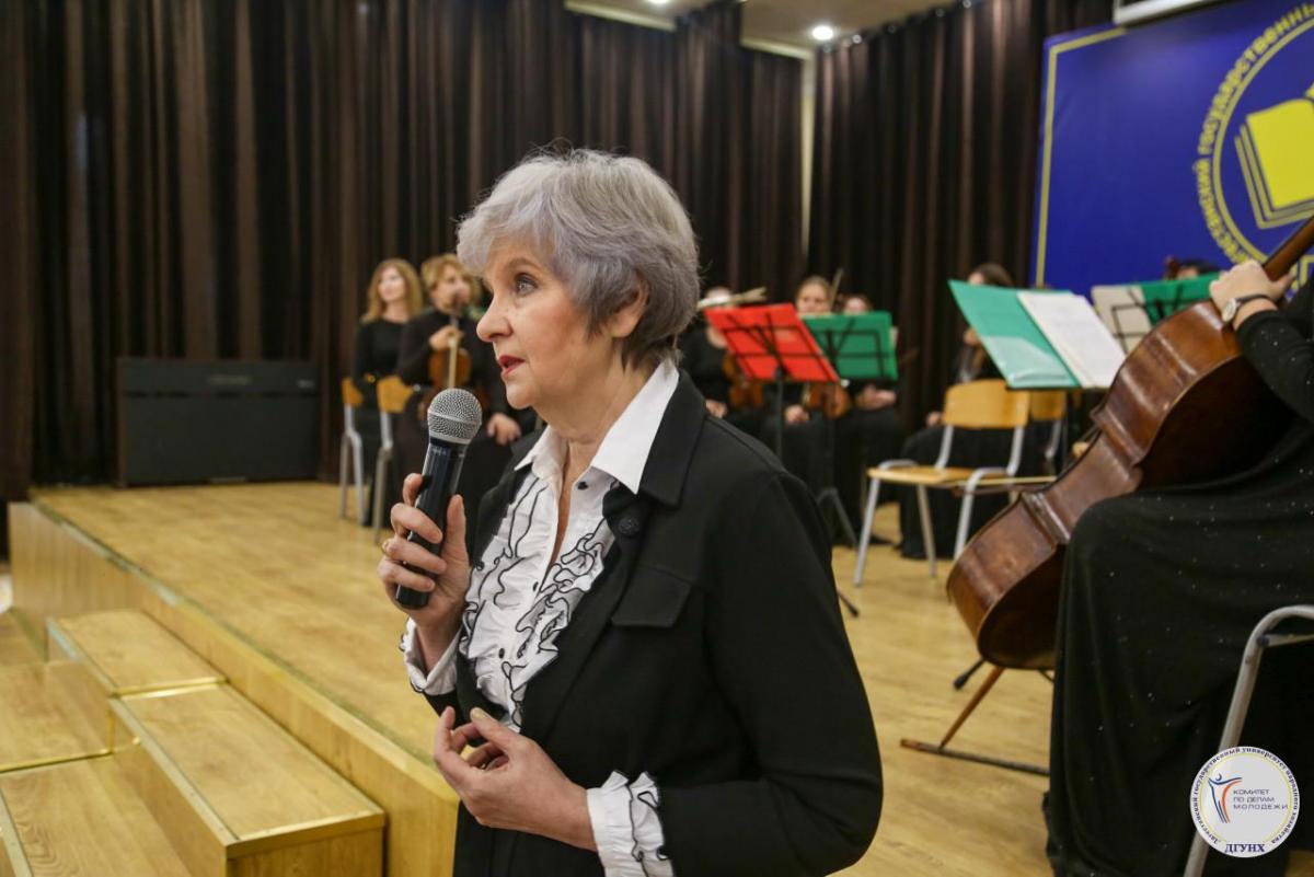Вторая часть мероприятия проходила в Гранд-холле, куда были приглашены сотрудники, студенты и активисты, для которых выступил камерный оркестр Станислава Хржановского Даггосфилармонии имени Татама Мурадова, которым дирижировала заслуженная артистка России Зарифа Абдуллаева.