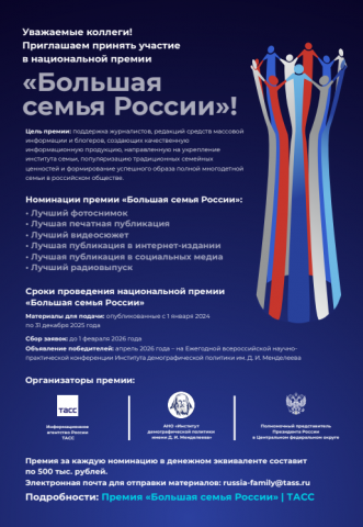 Первая национальная премия "Большая семья России" предназначена для представителей СМИ за лучшее освещение темы семьи в информационном пространстве.