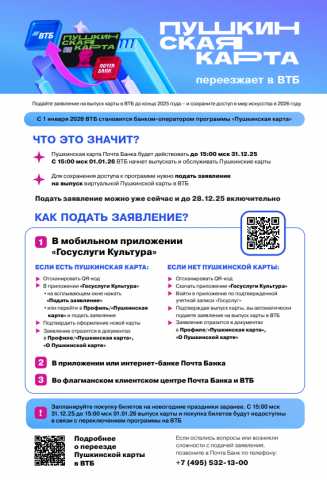 С 1 января 2026 г. роль оператора федеральной программы «Пушкинская карта» (далее – Программа) передается от АО «Почта Банк» к Банку ВТБ (ПАО), в связи с чем Банк ВТБ (ПАО) проводит кампанию по сбору согласий (заявок) целевой аудитории (молодые люди в возрасте от 14 до 22 лет) на перевыпуск карт Программы в срок до 28 декабря 2025 г.