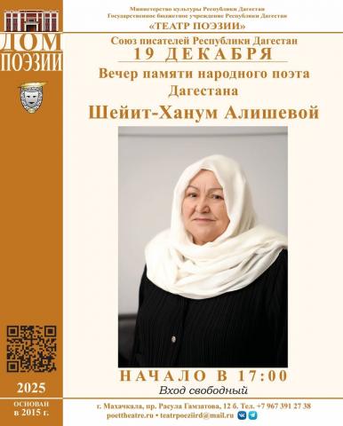 Завтра, 19 декабря, в 17:00 в Театре поэзии состоится Вечер памяти народного поэта Дагестана Шейит-Ханум Алишевой.