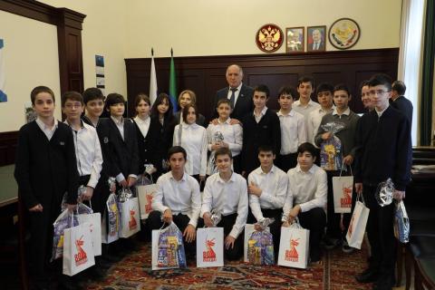 В свою очередь, Абдулмуслим Абдулмуслимов вручил ученикам сладкие новогодние и индивидуальные подарки. После встречи с премьером дети были приглашены на праздничный обед в столовую, расположенную в Доме Правительства.