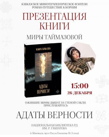 26 декабря в 15:00 в Национальной библиотеке им. Расула Гамзатова состоится презентация дебютного романа Миры Таймазовой «Адаты верности».