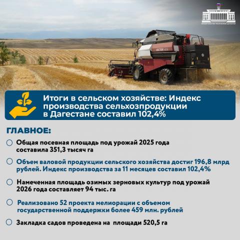 Аграрный сектор экономики Дагестана является ключевой сферой народнохозяйственного комплекса. Регион располагает огромным аграрным потенциалом, чему свидетельствуют лидирующие позиции среди субъектов России по производству основных видов сельхозпродукции – овощей, винограда, риса, плодов, баранины, шерсти. На долю отрасли приходится 20% ВРП.