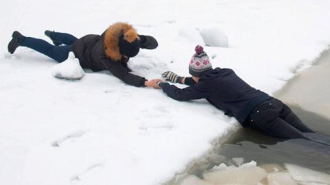 Нельзя подходить к полынье стоя, лёд может не выдержать.