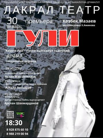 Н️овый спектакль на лакском языке ️«Гули»️ поставлен в Лакском театре по мотивам повести Казбека Мазаева заслуженным артистом России, главным режиссером театра Асланом Магомедовым. Пьеса рассказывает о жизни женщины-ашуга Гули. Режиссер предлагает свою сценическую версию истории.